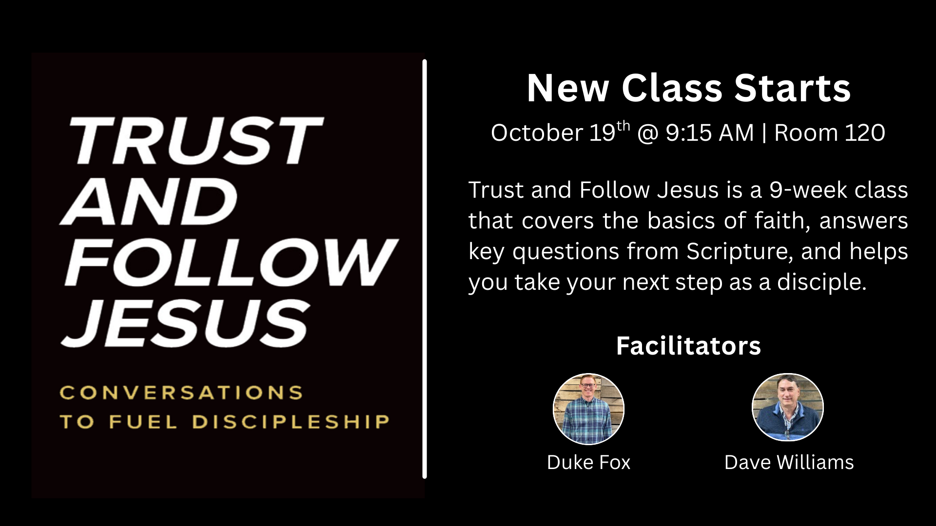New class starts October 19 at 9:15am and will meet in Room 120. This class will be facilitated by Duke Fox and Dave Williams. Trust & Follow Jesus is a 9-week class that covers the basics of faith, answers key questions from Scripture, and helps you take your next step as a disciple.