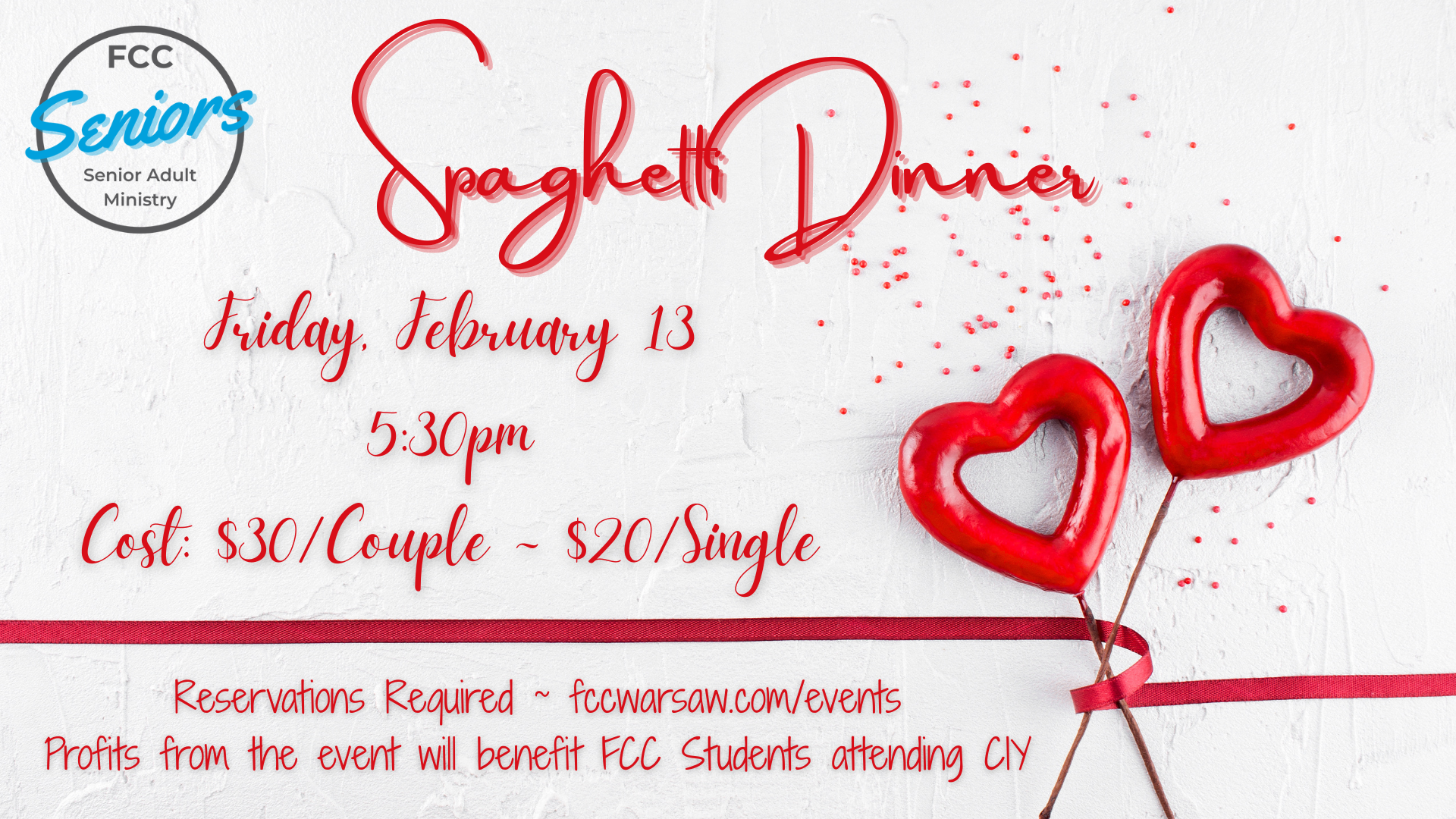 FCC Senior Adult Ministry is hosting a Valentine's Dinner, Friday, February 13, at 5:30pm. Make your reservation for an evening of fun and fellowship! Our guest speaker for the event will be Jim Bowling. Cost per couple is $30/Single is $20. All profits from the evening will benefit FCC Students attending CIY this year. Payment can be given to Geri Heagy. (Please do not put in the offering boxes.)