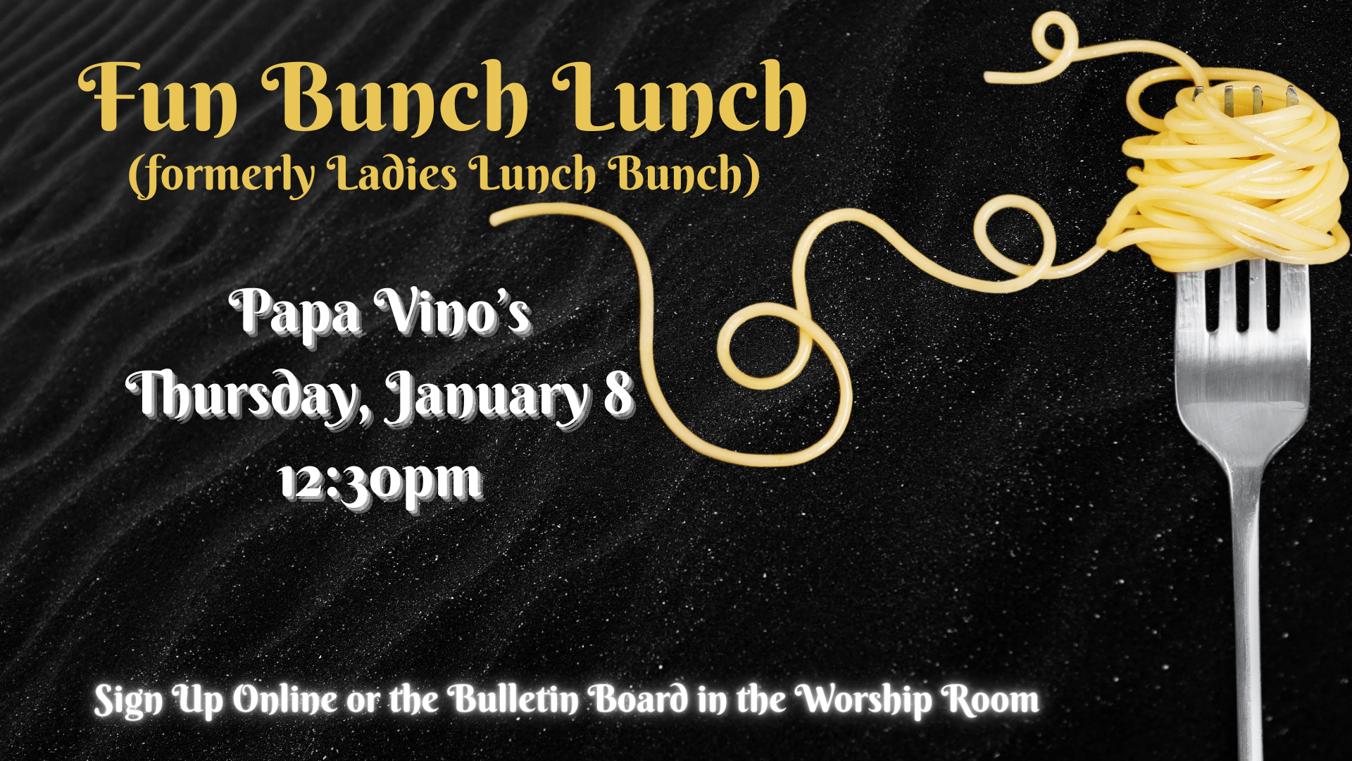 FUN BUNCH LUNCH (formerly Ladies Lunch Bunch) - Thursday, January 8, 2026. Join us for lunch at Papa Vino's, 2640 Escalade Way, Warsaw. This will be a fun way to start off the New Year together!